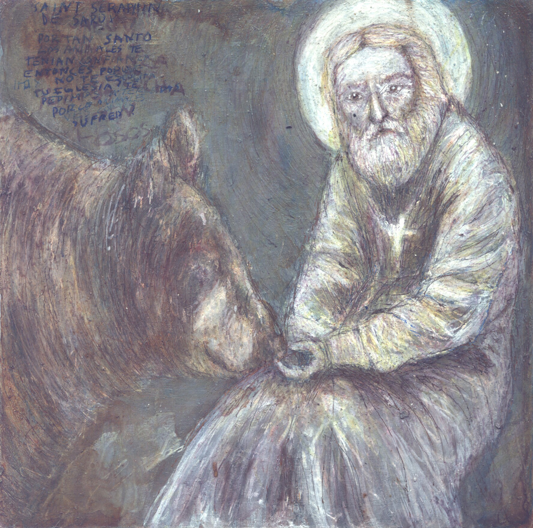 Un vieux moine s’avance, courbé par les ans, sa soutane de toile écrue et sa calotte paraissent blanches. Dans la douceur des ténèbres on perçoit son visage ridé, éclairé par des yeux tout bleus. Il semble rayonner d’une pureté non terrestre, d’un silence céleste. On voit parfois cet aspect de sagesse réservée sur les visages des vieux paysans russes. Le visage du vieux moine semble empreint de tous les bruissements de la forêt, de sa lumière, de son silence.