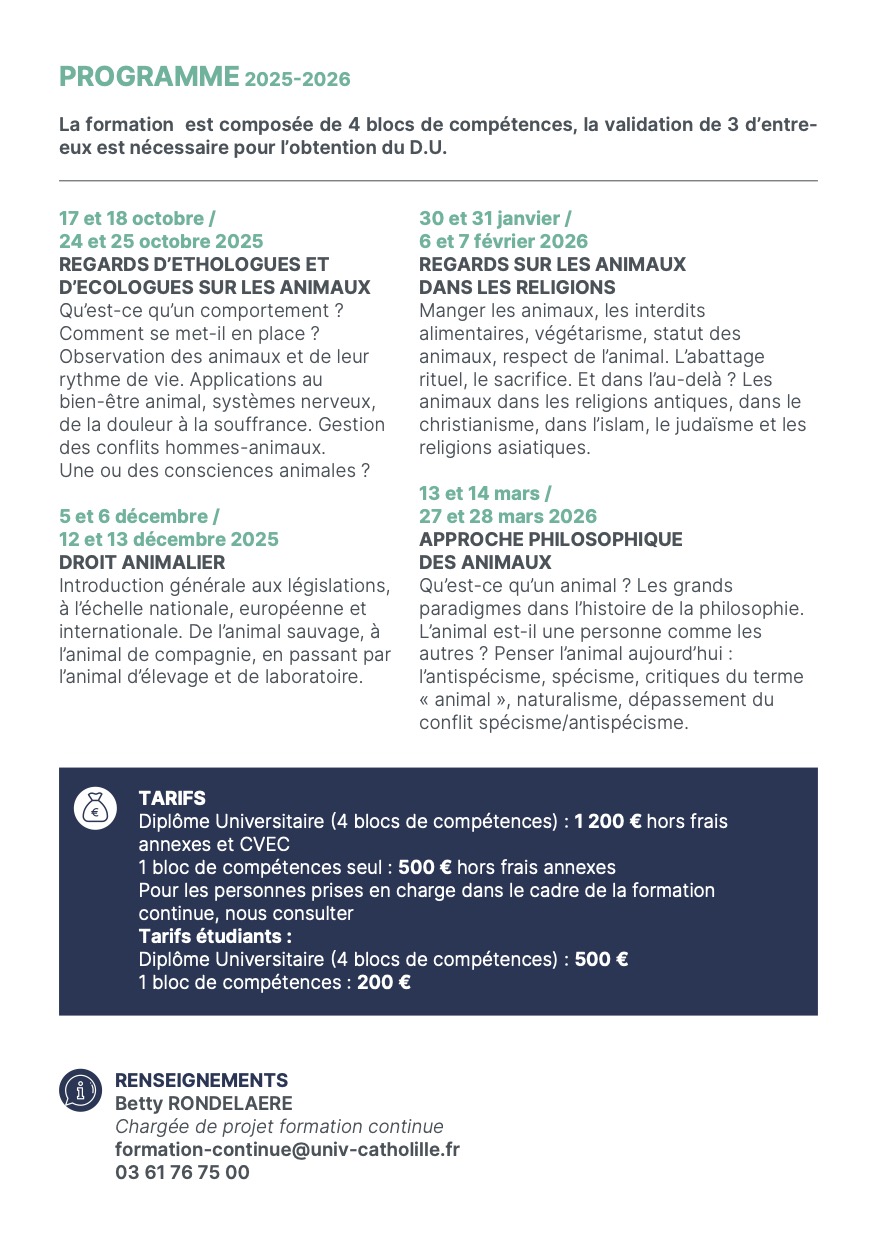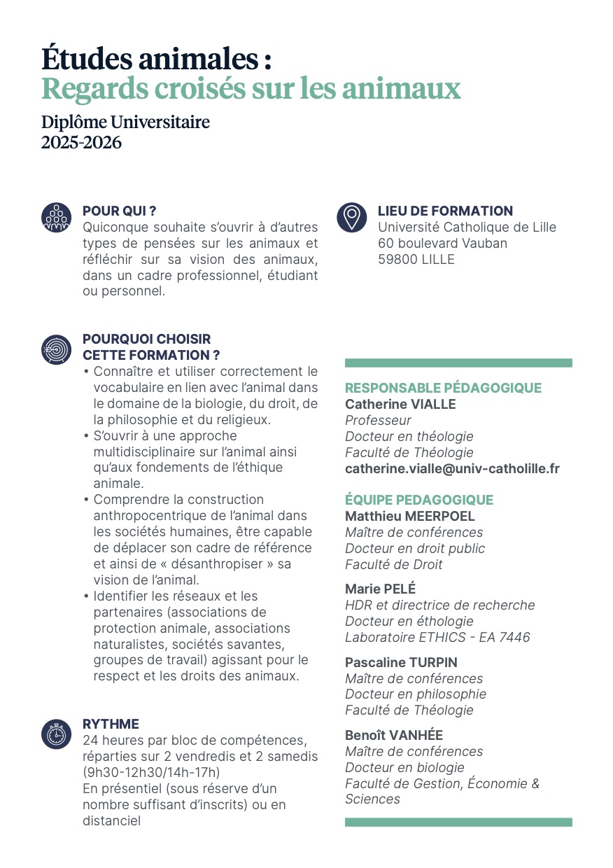 Cette formation pluridisciplinaire fait appel aux approches issues du monde de la philosophie, de la biologie, du droit et des sciences des religions dans le but de croiser autant de regards possibles sur les animaux.