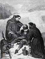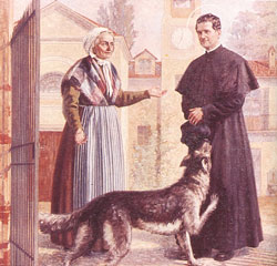Au XIX° s. un chien mystérieux, voire « miraculeux » [22] dont l’histoire ne peut être mise en question puisqu’elle est même attestée dans le procès de canonisation, sauve la vie à un célèbre prêtre éducateur d’enfants. Il s’agit du prêtre italien de Turin, don Bosco. Les actes de canonisation mentionnent à plusieurs reprises le nom du chien : il Grigio. Les biographes de don Bosco, en évoquant il Grigio, parlent d’un « défenseur inattendu envoyé par le Ciel ». [23] Don Bosco rejoint ces biographes, puisqu’en 1872, à la question posée par la baronne A. Fassati sur l’origine du chien, il répondit : « Dire qu’il s’agit d’un ange ferait rire. Néanmoins on ne peut prétendre que c’est un chien ordinaire ». [24] Il en parlait souvent lors de ses voyages, notamment à Paris, et son biographe [25] ! Et voici le contexte de l’intervention salvatrice du chien :