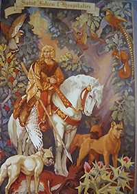 Avec saint Bernard, fondateur de l’abbaye de Clairvaux, on retrouve l’élément du chien, signe d’une destinée exceptionnelle de l’enfant qui naît, puisque c’est avant sa naissance que sa mère rêve qu’elle met au monde un chien blanc qui chasse les ennemis de Dieu. Enfin retenons que le chien -généralement un épagneul- figure également comme attribut de sainte Marguerite de Cortone.