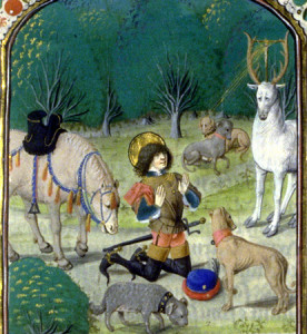 Dans l’iconographie chrétienne le chien a un rôle positif et actif à jouer aux côtés des saints. On différencie le chien berger de saint Wendelin du chien de chasse de saint Eustache, saint Hubert et saint Julien l’Hospitalier. On différencie aussi le chien blanc apparaissant dans l’hagiographie de saint Bernard de Clairvaux du chien blanc et noir de saint Dominique portant un flambeau dans sa gueule. Toutes ses possibilités, en comparaison avec le chat qui n’est mentionné comme attribut d’un saint qu’une fois -saint Cadoc-, démontrent la richesse et la haute fréquence dans l’utilisation du chien [2] . Si on représente souvent Dominique de Guzman (1170-1221), fondateur des frères prêcheurs, avec un chien, c’est parce que sa mère, Jeanne d’Aza, vit à la naissance de son fils un chien assis sur le lit avec une torche dans la gueule ! De même dans la peinture dominicaine, on verra les chiens mettre en fuite les loups (hérétiques) qui s’attaquent aux brebis (fidèles). Des analogies pourront être tirées avec les peintures des jésuites lors de la Contre-Réforme.