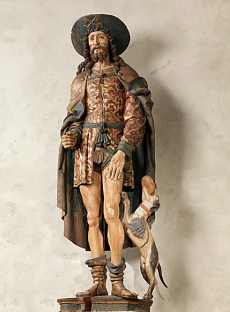 Le chien a-t-il contribué à la popularité du saint ? Ce n’est évidemment de loin pas le point essentiel pour les récits hagiographiques, saint Roch étant surtout invoqué pour prévenir les maladies contagieuses et la peste. Mais cet élément canin, que l’on retrouve surtout dans les représentations picturales et sculpturales, reste très présent dans l’art. [19] C’est probablement l’attribut du chien qui a contribué au choix de saint Roch comme protecteur des animaux, plus particulièrement du bétail. Ainsi les paysans n’hésiteront-ils pas à l’invoquer lors de certaines maladies de leur bétail (peste porcine, épizooties, peste bovine…). [20] Notons enfin que suite à la « contamination » de l’histoire de saint Roch avec celle de saint Lazare, également patron des lépreux, le chien se verra souvent représenter sur les peintures en train de lécher les plaies de saint Roch. [21]